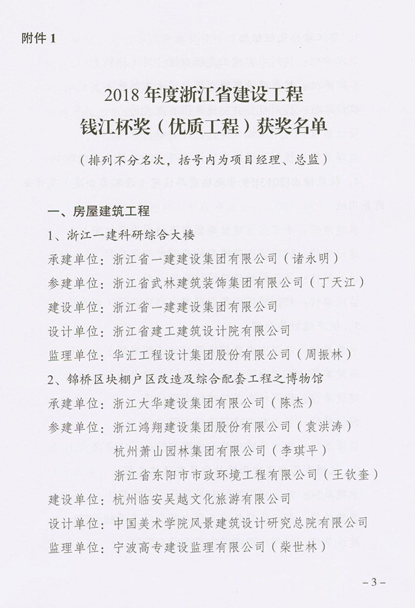 喜報!近日,省建設(shè)廳頒發(fā)了2018年度浙江省建設(shè)工程“錢江杯”(優(yōu)質(zhì)工程)文件,我公司“麗水市體育館體育中心工程、松陽縣供電局電力調(diào)度生產(chǎn)綜合用房工程”分別獲得2018年度“錢江杯”(優(yōu)質(zhì)工程)獎。